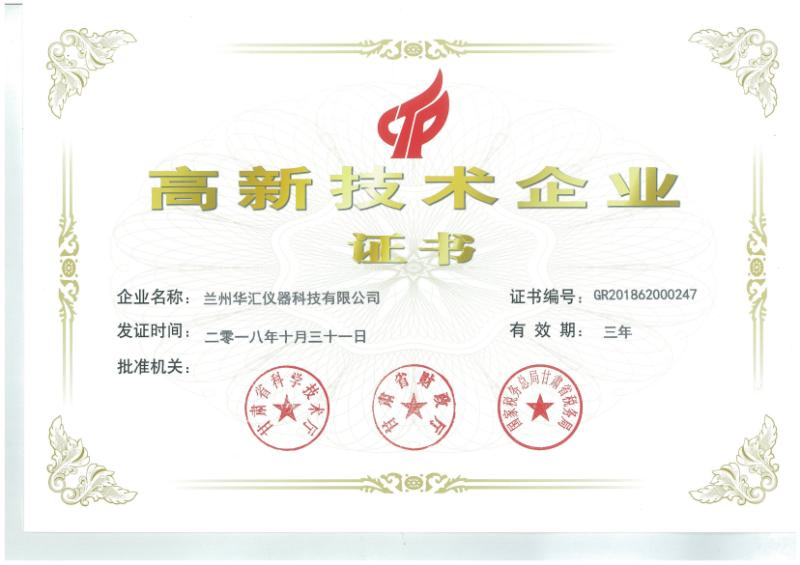 經(jīng)國家科技部、財(cái)政部、國家稅務(wù)總局專家評審,蘭州華匯儀器科技有限公司通過高新技術(shù)企業(yè)認(rèn)證,獲得國家頒發(fā)的《高新技術(shù)企業(yè)證書》。